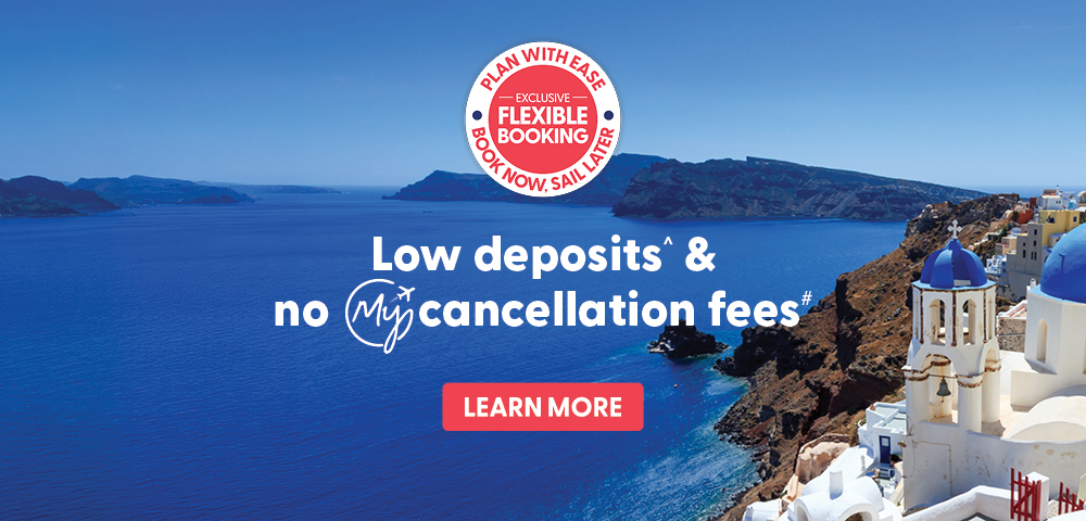^A flexible low deposit from $299 per person applies to select My Cruises packages and new bookings. The deposit amount and eligibility will be confirmed at the time of booking. The flexible deposit is refundable (subject to third party supplier cancellation fees) 12 months or more before the scheduled package departure date when cancelled under the special Flexible Booking Cancellation Conditions. #Customers may cancel their booking 12 months or more before the scheduled package departure date and receive a refund without My Cruises’ standard cancellation fees. Any cancellation fees charged by third party suppliers – including airlines, cruise lines, hotels or tour operators – may still apply and are not covered under this policy. This policy is valid only for eligible My Cruises packages as specified at the time of booking, and all refunds will be processed back to the original form of payment.
