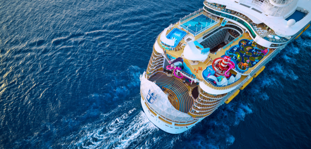 Aerial view of a large cruise ship sailing through deep blue waters, featuring pools, slides, and vibrant deck areas.